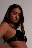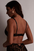 Бюстгальтер - пуш ап із злегка ущільненою формою чашок на кісточках; чашки оснащені подушками, що виймаються, і покриті тюлем з вишивкою з оксамитовим напиленням. Бічні панелі доповнені вставками із гіпюру. Регульовані бретелі виконані з нееластичного гіпюру та доповнені металевими кільцями.