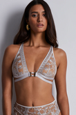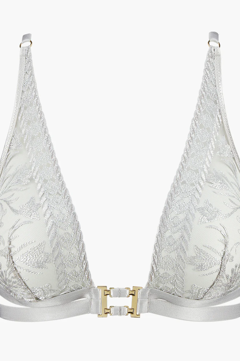 Зручний трикутний бюстгальтер Magnetic Spell без кісточок прикрашений сексуальною вишивкою, що сягає аж до плечей, підкреслюючи глибину декольте. Золотистий шарм, натхненний антикварними пряжками, прикрашає привабливу тканинну смужку, яка структурує бюст. Бретелі перехрещуються на спині в сучасному спортивному стилі.