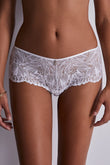 Труси-боксери із середньо-заниженою посадкою практично повністю виконані з розкішного мережива з екзотичним квітковим орнаментом. Доповнено декоративною металевою деталлю.