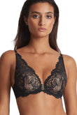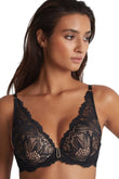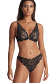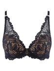 Бюстгальтер - пуш ап c ущільненою формою чашок із прошарком із мусу; на кісточках. Чашки з мусу бежевого кольору, покриті чорним розкішним мереживом з екзотичним квітковим орнаментом. Центральна панель доповнена металевим аксесуаром. Задні панелі дубльовані. Регульовані бретелі.