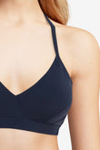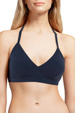 Купальний бюстгальтер із ущільненою трикутною формою чашок без кісточок. Чашки покриті мікрофіброю в смужку. Бретелі зав'язуються довкола шиї.