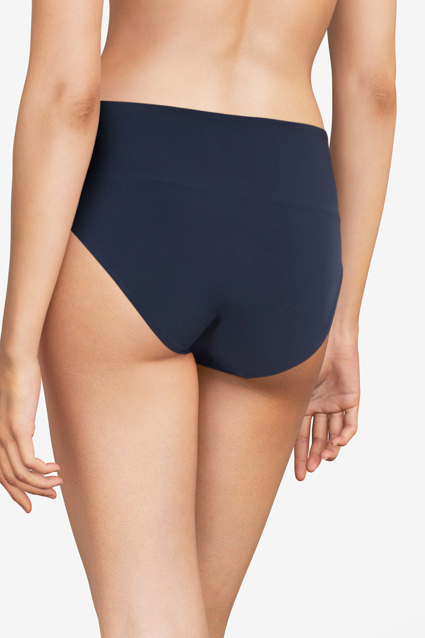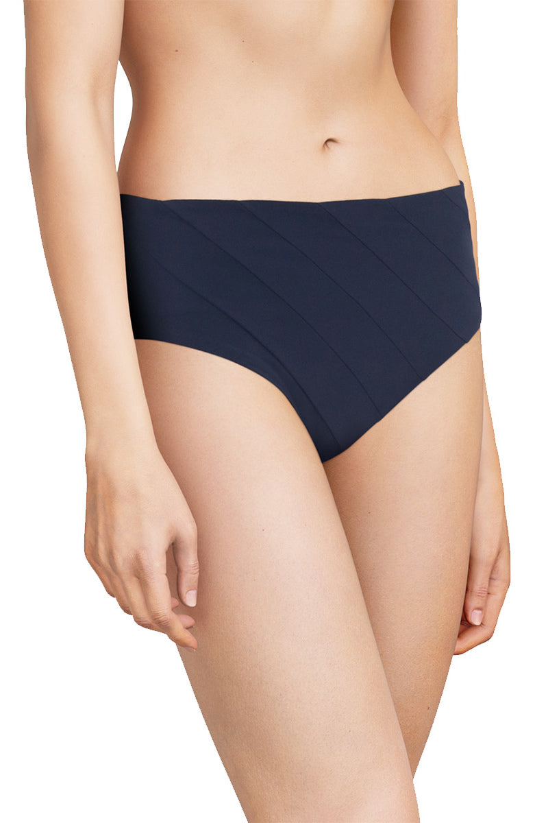 Плавки – кюлоти із завищеною посадкою. Висоту пояса можна регулювати за допомогою відвороту. Передня панель виконана з мікрофібри у смужку.