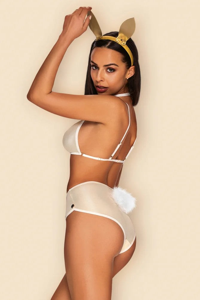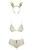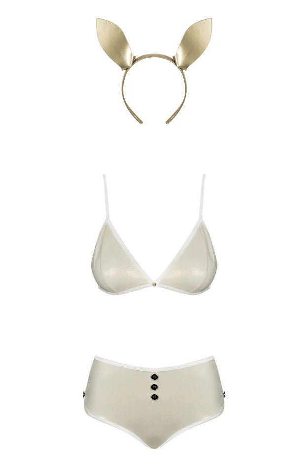 Ви бачите це диво? Це ти в костюмі Neo Goldes! Тож придивіться уважніше: блискуча тканина, бюстгальтер з трикутними чашечками та шорти з високою талією, які підкреслять талію. Цей костюм подарує вам масу задоволення і в той же час підкреслить ваші жіночі вигини. Щоб додати і без того чарівну атмосферу, ми додали ще кілька аксесуарів – золоту пов’язку з заячими вушками та чокер з бантом. Тому? Хочете повеселитися?