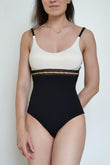 Модель відшита в комбінації тканин молочного та чорного кольорів з додаванням оздоблення кантом під грудьми.