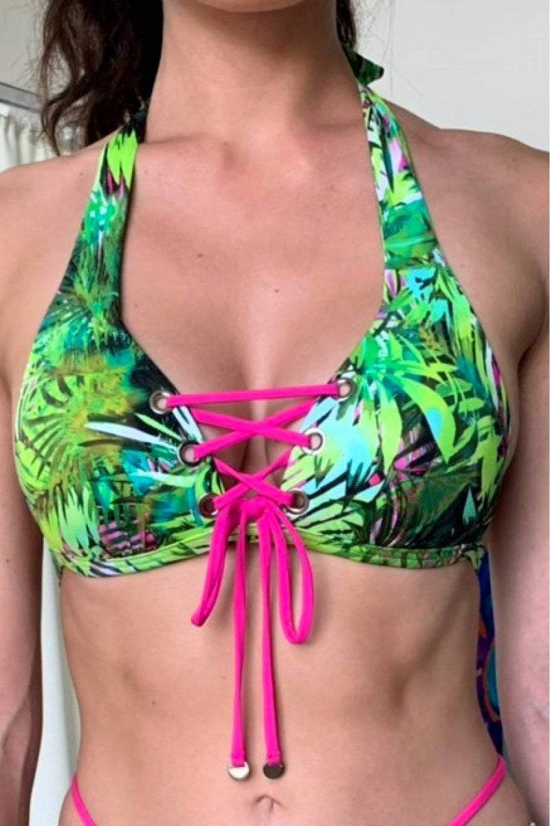 Формована чашка з ефектом «пуш-ап» на каркасній підтримці. Бюст декорований яскравою шнурівкою і тропічним принтом. Регульовані бретелі навколо шиї. Застібка ззаду на зав'язках.