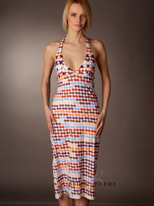 - Халтер. Такой фасон характеризуется наличием бретелей, которые завязываются на шее. Он может визуально уменьшить широкие бедра.