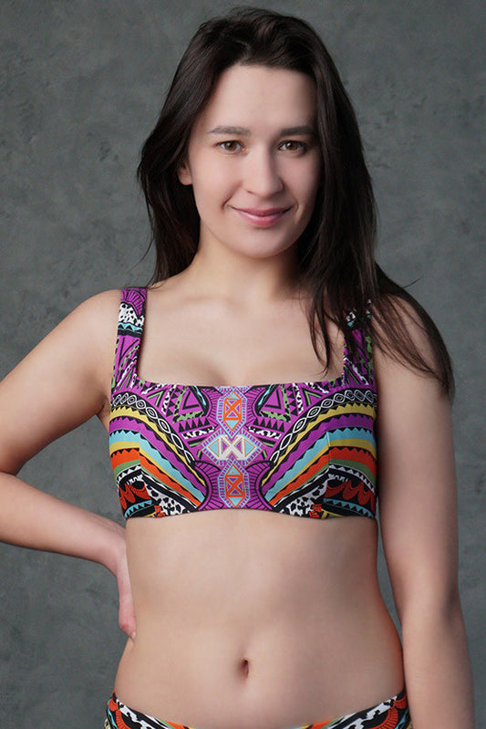 - Если у вас широкие бедра и узкие плечи, “уравнять” фигуру можно с помощью однотонных плавок (без рисунка и декора) и лифа с ярким принтом.