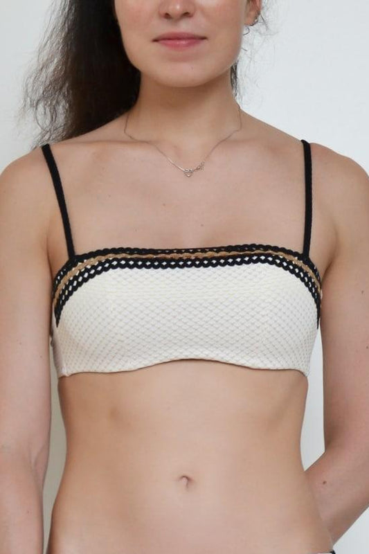 - Бандо. Это разновидность раздельных купальников, где лиф больше похож на топ и не имеет бретелей. Он не очень подходит для большой груди из-за слабой поддерживающей способности.