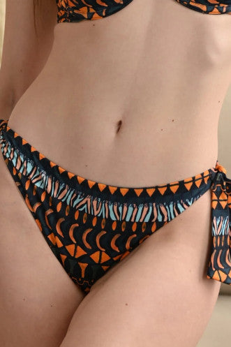 - Для узких бедер и широких плечей оптимальный вариант — сочетание принтованных плавок (или в горизонтальную полоску) и однотонного лифа.