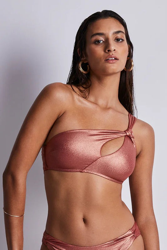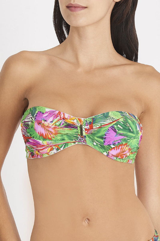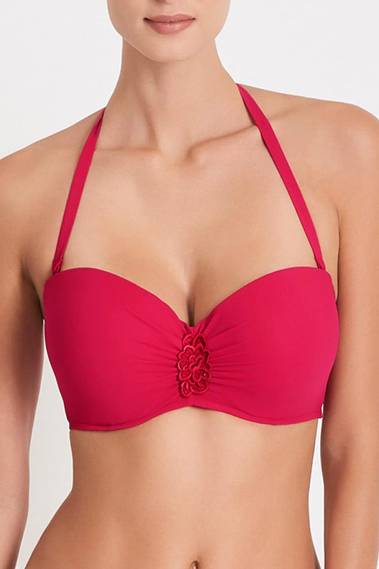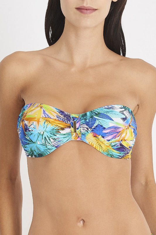 - Бандо. Это разновидность раздельных купальников, где лиф больше похож на топ и не имеет бретелей. Он не очень подходит для большой груди из-за слабой поддерживающей способности.