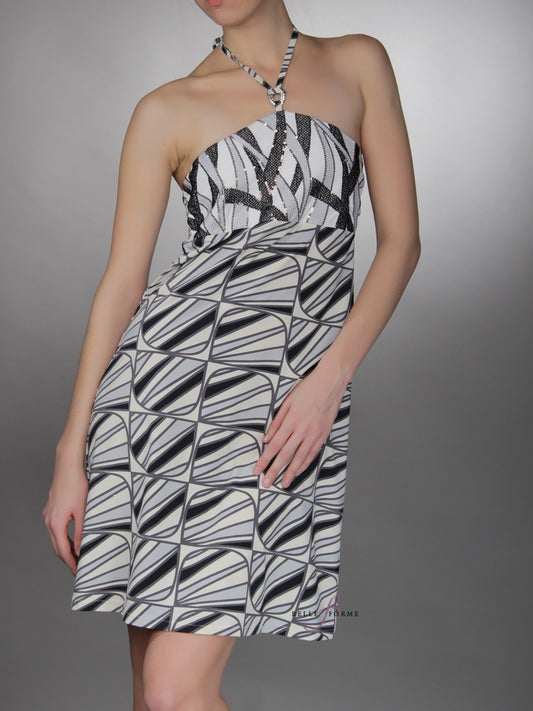 - Халтер. Такой фасон характеризуется наличием бретелей, которые завязываются на шее. Он может визуально уменьшить широкие бедра.