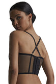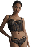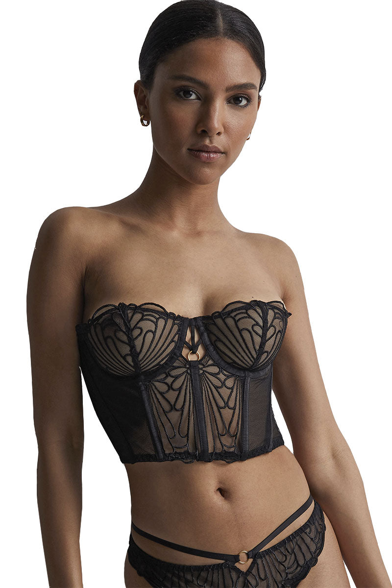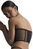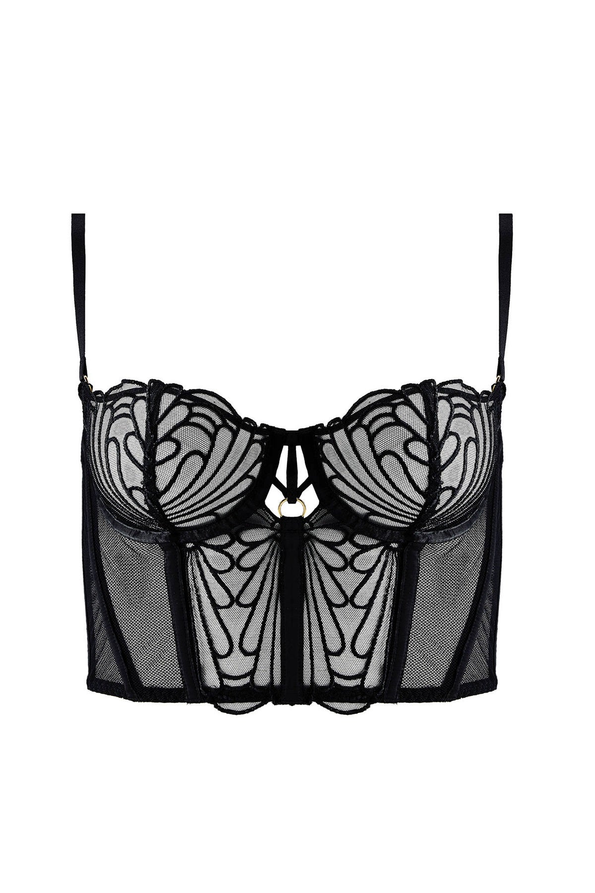 Бюстье с мягкой достаточно открытой формой чашек на косточках; с отстегивающимися бретелями. Чашки и центральная панель выполнены из тюля со швейцарской вышивкой. Боковые и задние панели выполнены из сетки.