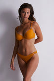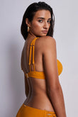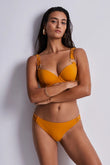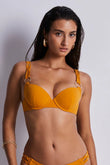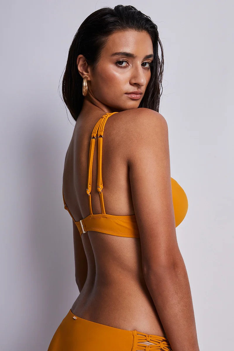 Обеспечивая гарантированный комфорт и поддержку до размера E благодаря невидимым формованным чашечкам, формованный купальник создает глубокое декольте с естественным эффектом пуш-ап. Бретели украшены переплетенными полосками, которые придают этому очень сексуальному изделию изысканный вид. Уникальный стиль с переплетенными полосками, вдохновленными макраме, украшенными маленькими золотыми трубочкам. Фиксированная чашка с уменьшающимся пуш-апом при увеличении размера для большего комфорта.