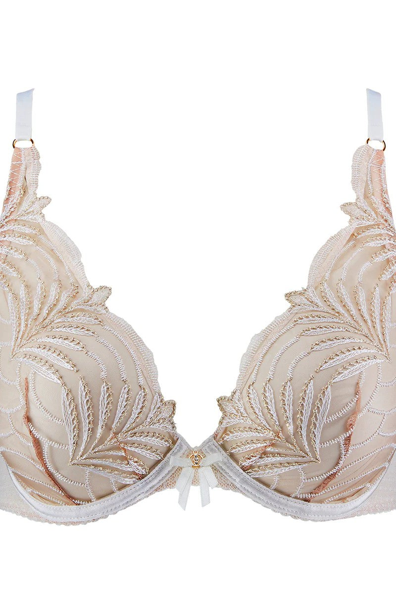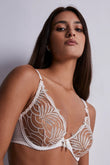 Бюстгальтер Hypnolove, отличается потрясающей вышивкой, которая достигает до плеч, открывая глубокое декольте, и украшен сексуальными золотистыми бретелями между чашечками. Благодаря полностью закрывающей грудь форме и прозрачному полотну, он сочетает в себе комфорт и соблазн в стильном изделии, предназначенном для повседневной носки.