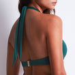 Бюстгальтер - пуш ап з ущільненою формою чашок із прошарком із мусу для надання візуально додаткового об'єму. Бретели з'єднуються з чашками за допомогою декоративних золотих кілець; зав'язуються довкола шиї. Бічні панелі із внутрішньої сторони дубльовані. Застібка – золота кліпса з логотипом.