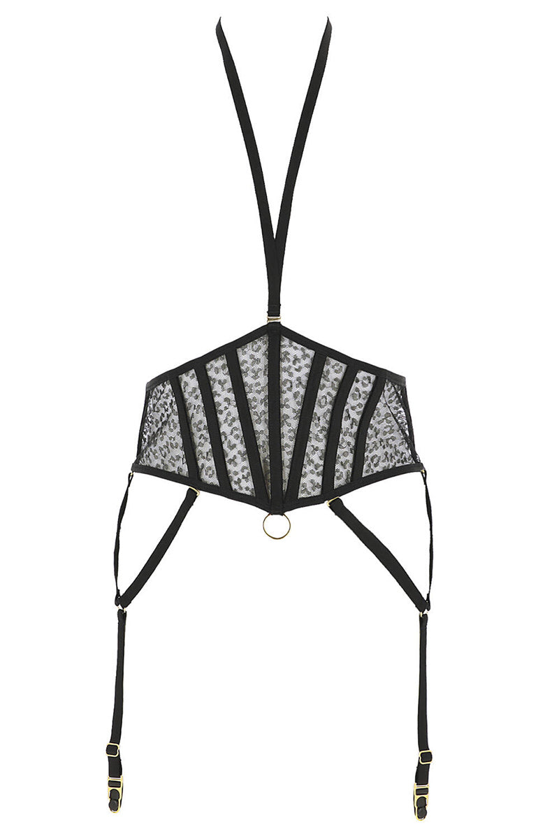 Пояс для чулок с дополнительным съемным аксессуаром на шею. Выполнен из жаккардового кружева, произведенного в Италии. Две отстегивающиеся и регулируемые подтяжки. Передняя панель оснащена косточками. Задняя панель регулируется, что позволяет добиться идеальной посадки.