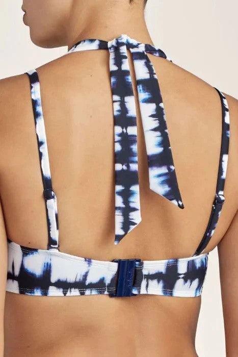 Верх бикини бандо – очень утонченный ретро-силуэт. Разнообразие образов благодаря съемным бретелям и вокруг шеи и темно-синим тонам.