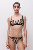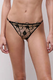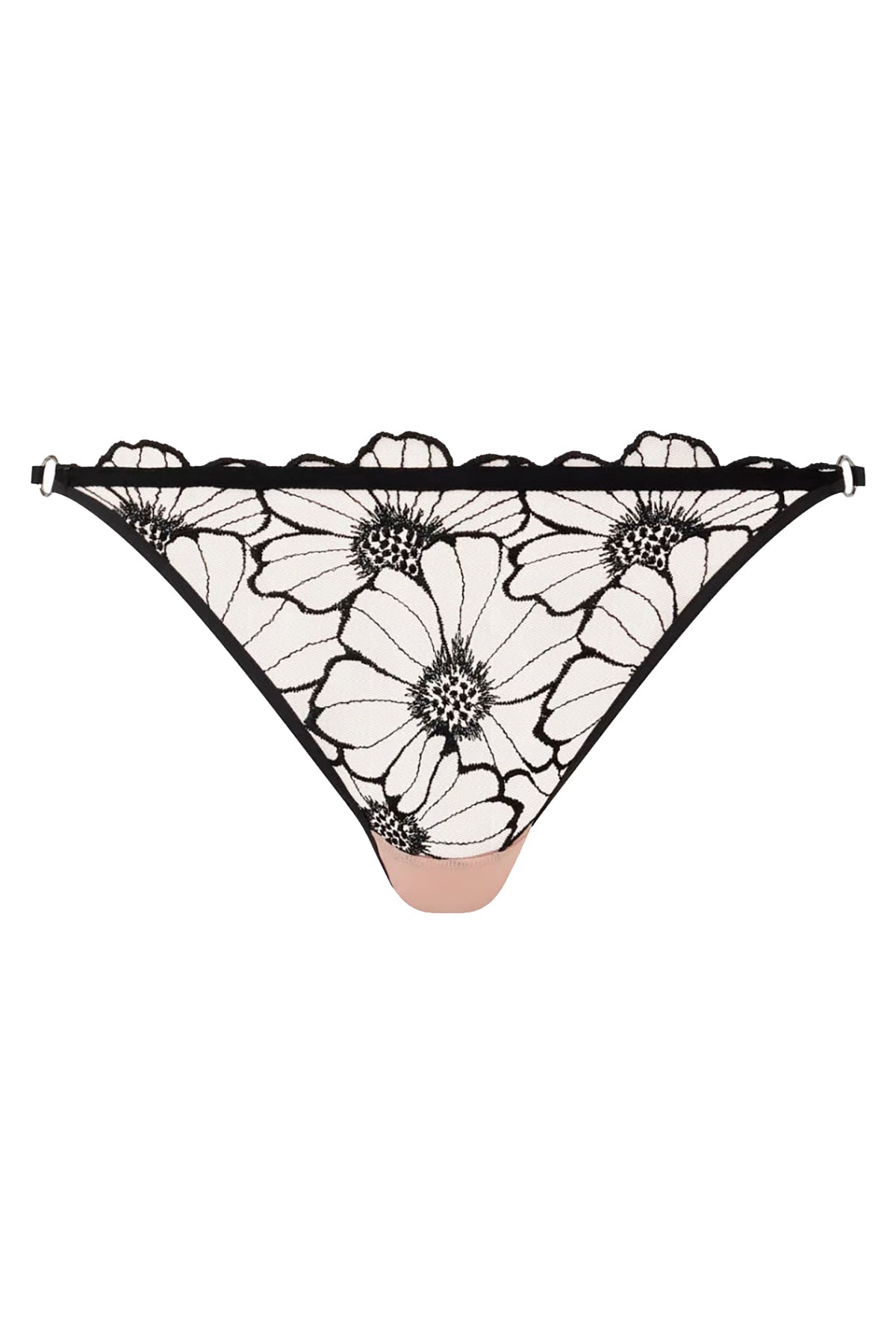 Трусы-стринги со средне-заниженной посадкой создают эффект дерзкой невинности благодаря сочетанию прозрачного тюля и крупной цветочной вышивки, напоминающей ромашки. Серебряные кольца на боковых панелях добавляют блеска и визуального акцента. Задняя панель максимально открыта для эффектного образа. Пояс модели состоит из двойных эластичных бретелей, которые подчеркивают изгибы тела и придают дополнительную пикантность.