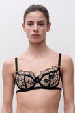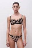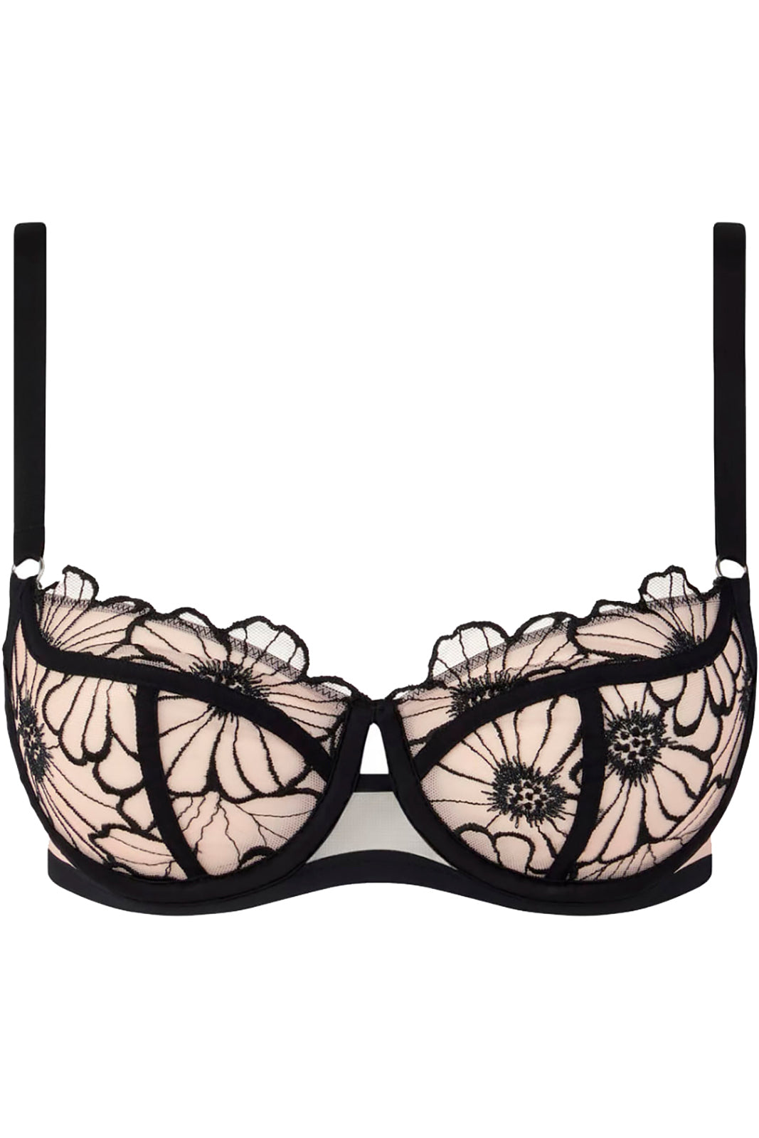 Бюстгальтер-балконет на косточках сочетает в себе изящную архитектуру и легкую игривость. Выполненный из прозрачного тюля, украшенного крупной цветочной вышивкой в виде ромашек, он подчеркивает женственность и придает образу романтическую нотку. Центральная панель украшена вырезом между чашками, а их верхний край обрамлен кокетливыми рюшами, которые придают модели изящный шарм. Балетная спинка и фиксированные эластичные бретели обеспечивают комфорт и надежную поддержку, а застежка-крючок на спинке завершает изысканный силуэт.