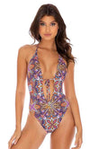 Сплошной купальник. Глубокий V-образный вырез с завязками. Завязки на шее. Высокий вырез