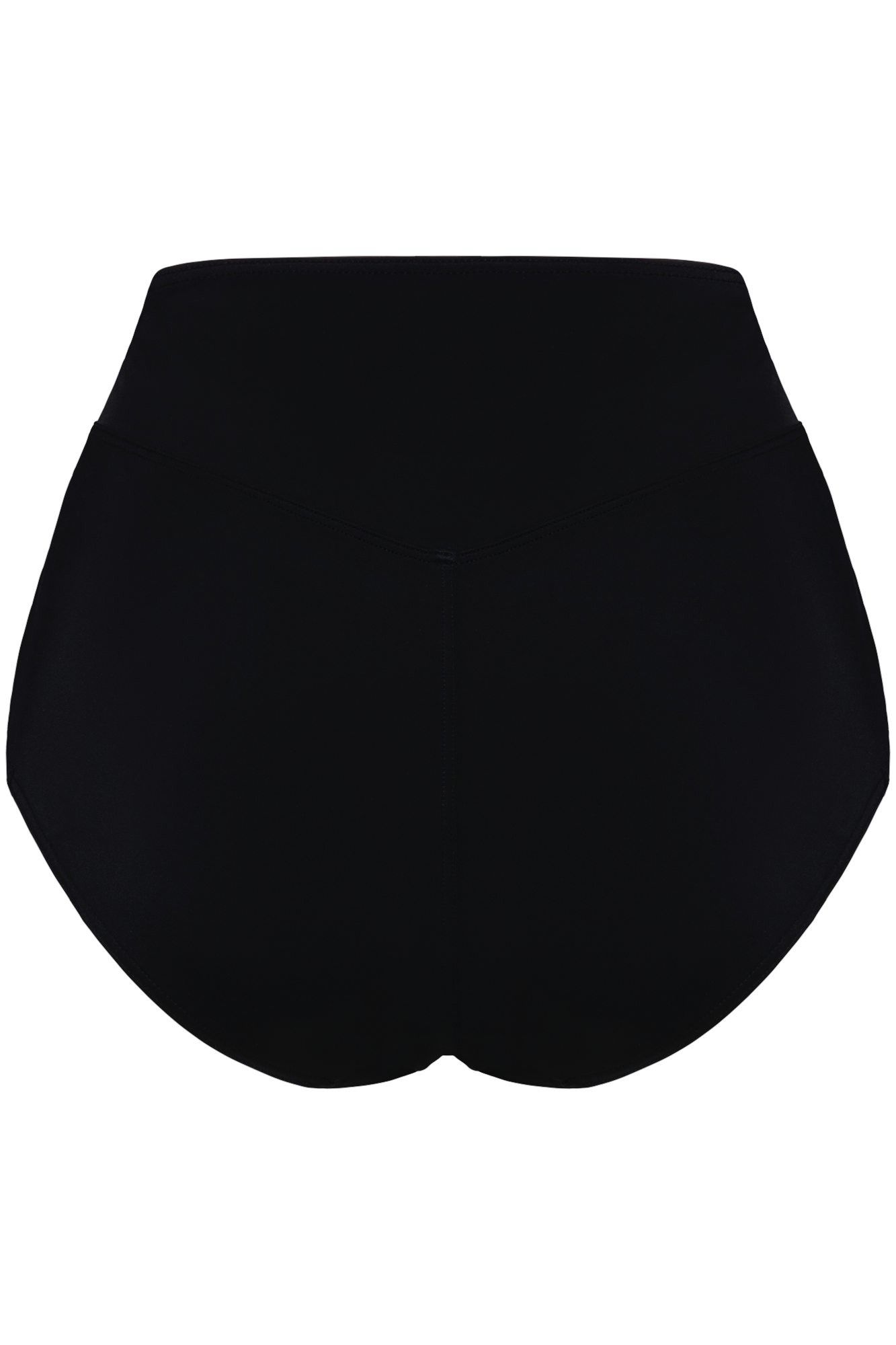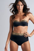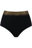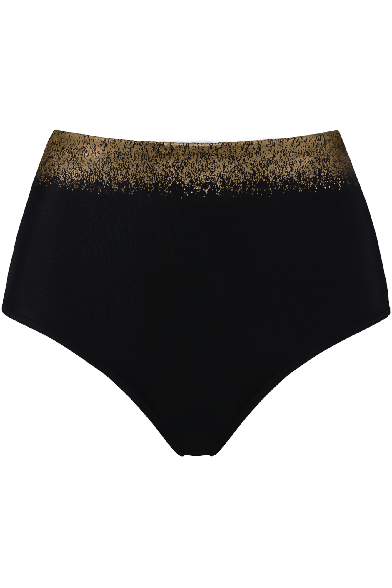 Трусы с высокой талией. Полностью выполнены из микрофибры, которая быстро сохнет, а золотое напыление обладает защитой от пляжного воздействия. Передняя панель дублирована для избежания прозрачности.