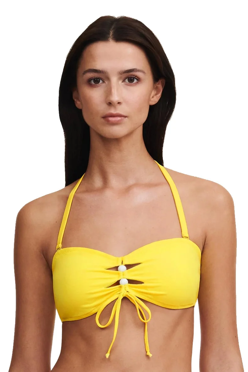 Бюстгальтер - бандо с мягкой формой чашек без косточек. Чашки оснащены съемными подушками для придания визуально дополнительного объема. Центральная панель дополнена декоративными жемчужинами. Боковые панели оснащены силиконовыми дорожками. Бретели, которые отстегиваются. Застежка - на спине на клипсе.