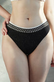 Плавки средней посадки. Металлическая золотистая фурнитура гипоаллергенна и устойчива к коррозии.