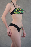 Купальник черного цвета с ярким принтом от немецкого бренда Toccata. Бюстгальтер-бандо с двойным пуш-апом для желаемой визуальной коррекции размера груди. Рассчитан для маленькой и средней груди. Чашки формованные, на каркасах. Пояс дублирован слоем ткани для качественной фиксации на теле, усилен боковыми силиконовыми косточками. Бретель тонкая, которую можно пропустить за шеей. Снимается в комплекте. Застежка золотистого цвета, металл устойчивый к коррозии.