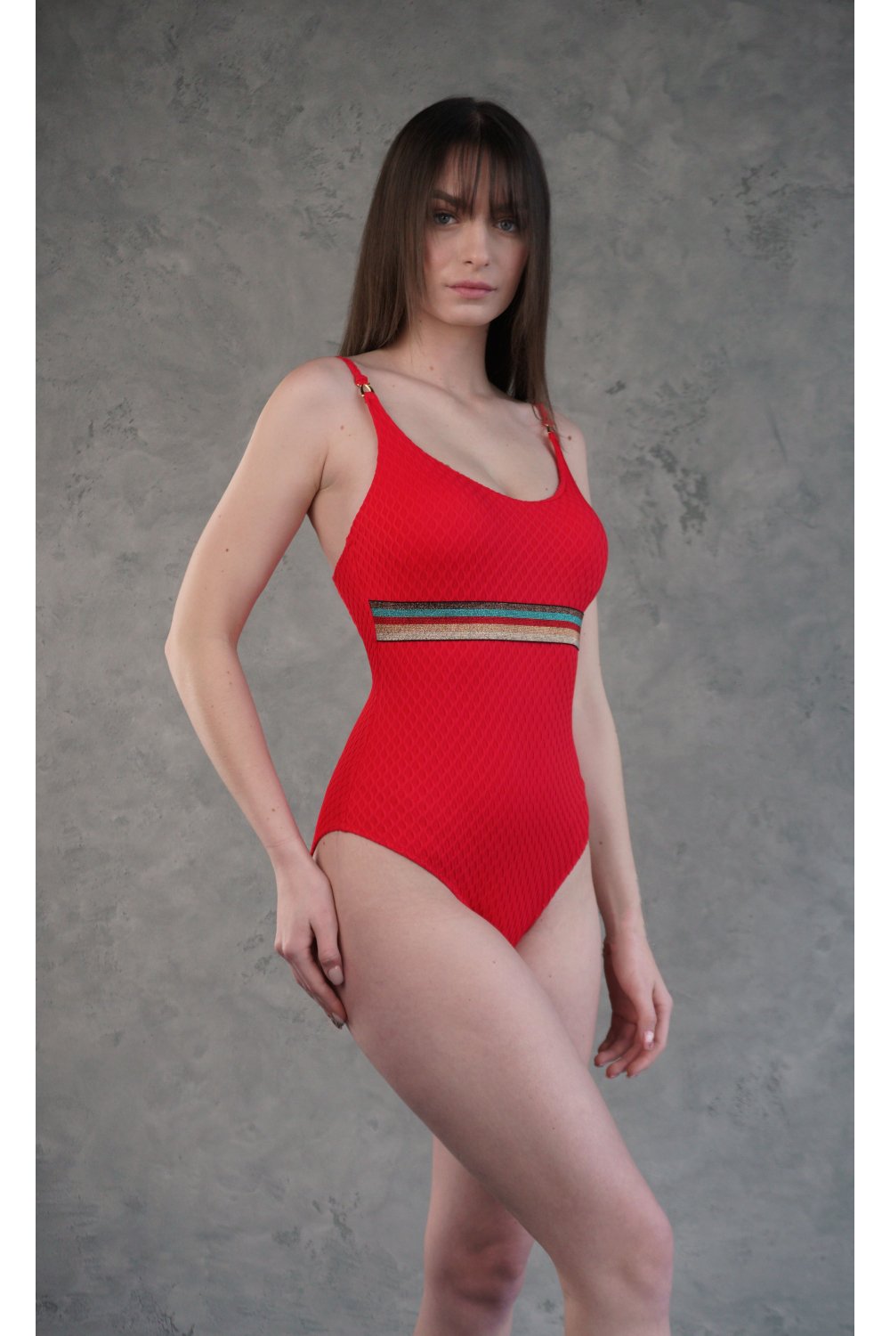 - Модель отшита из фактурной ткани, металлический декор на бретелях.