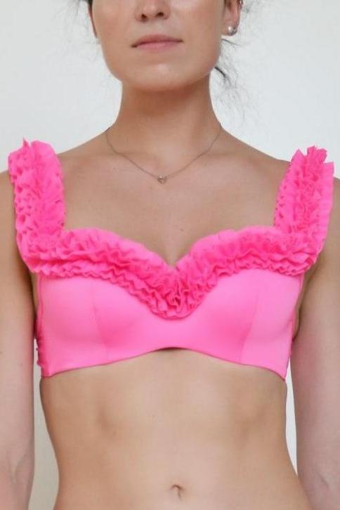 Плавки-бразильяно средней посадки. По центру спинки - шов. Верх плавок- рельефные рюши
