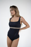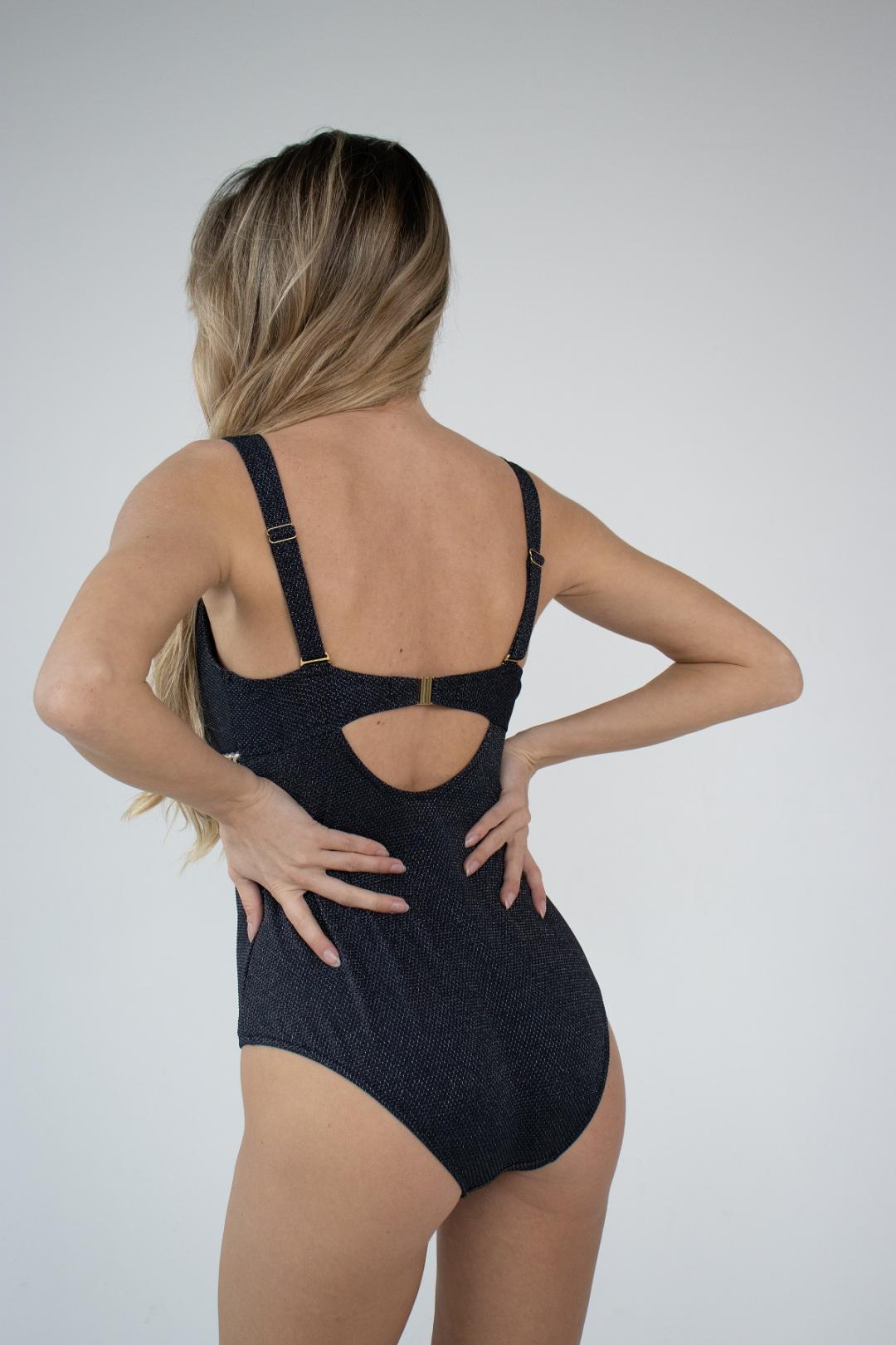 Сплошной купальник с лифом, который фиксируется на отдельную застежку. Бретели широкие, регулируемые. Нижний утягивающий слой.